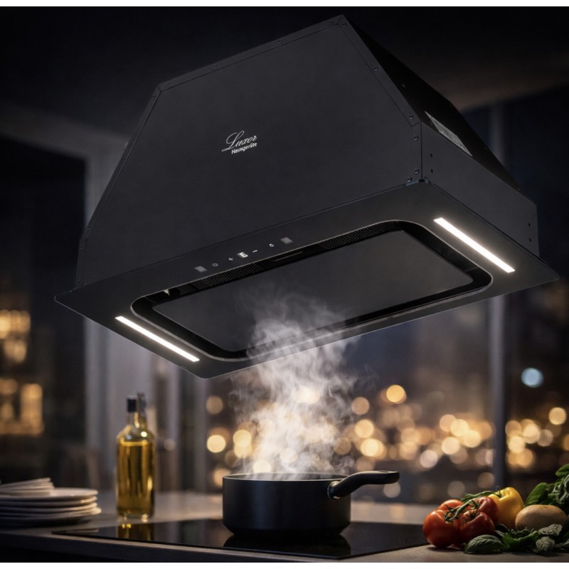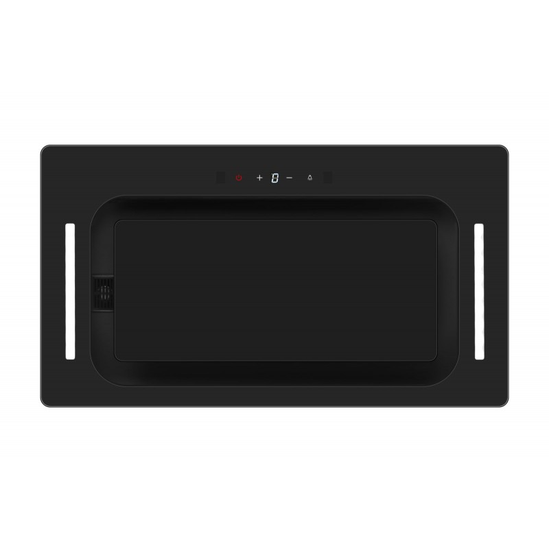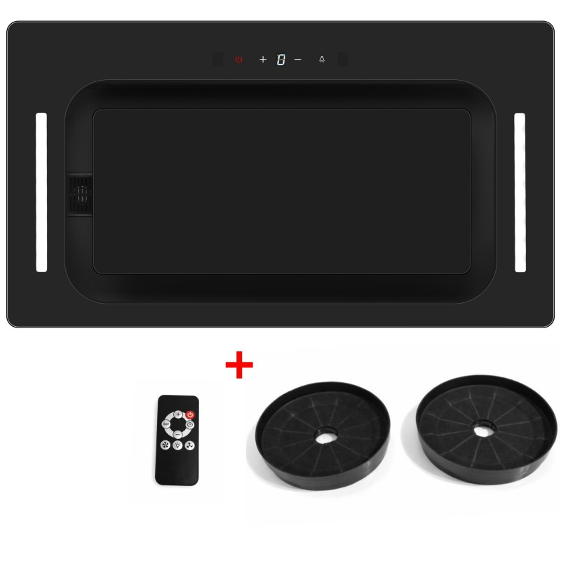 дистанційний пульт управління, датчик увімкнення витяжки від запаху, таймер відключення, жк дисплей, 2 лампи освітлення LED, зворотний клапан, гофро труба в подарунку, повністю скляний фасад чорного кольору, підсвітка індикації керуваня.